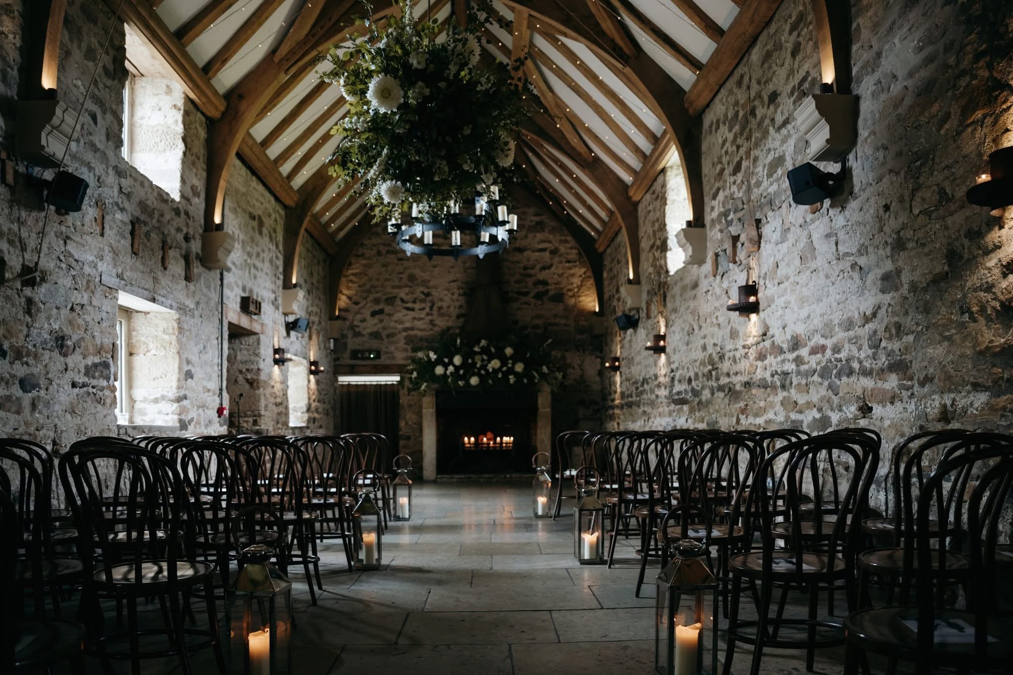 The warm, rustic setting inside Healey Barns before the ‘I dos.’ Pure Northumberland barn wedding magic, illuminated by candlelight.